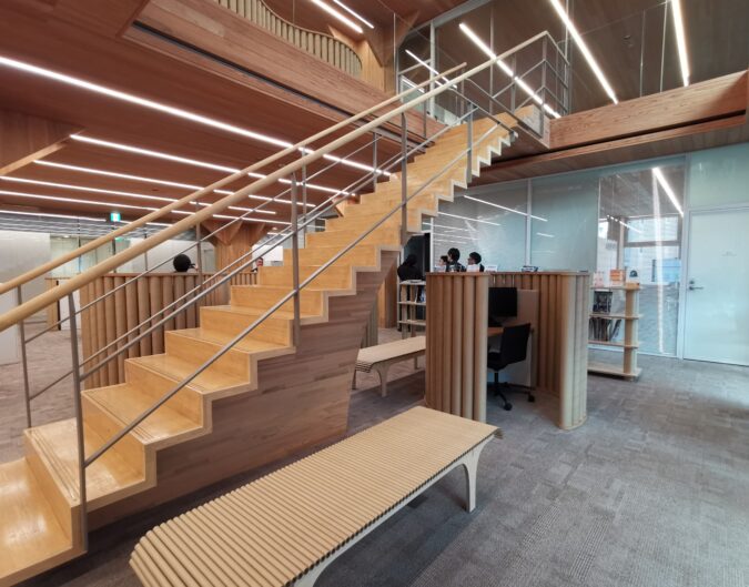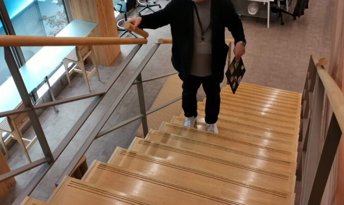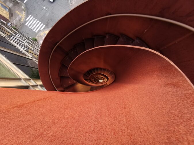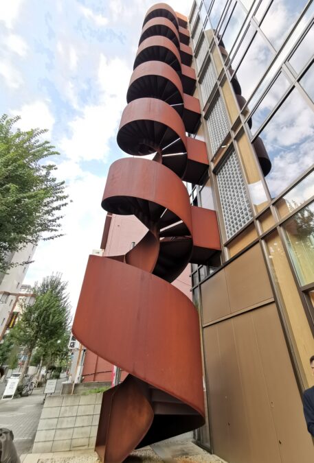 外部にあるコールテン鋼でつくられた鉄骨の避難階段